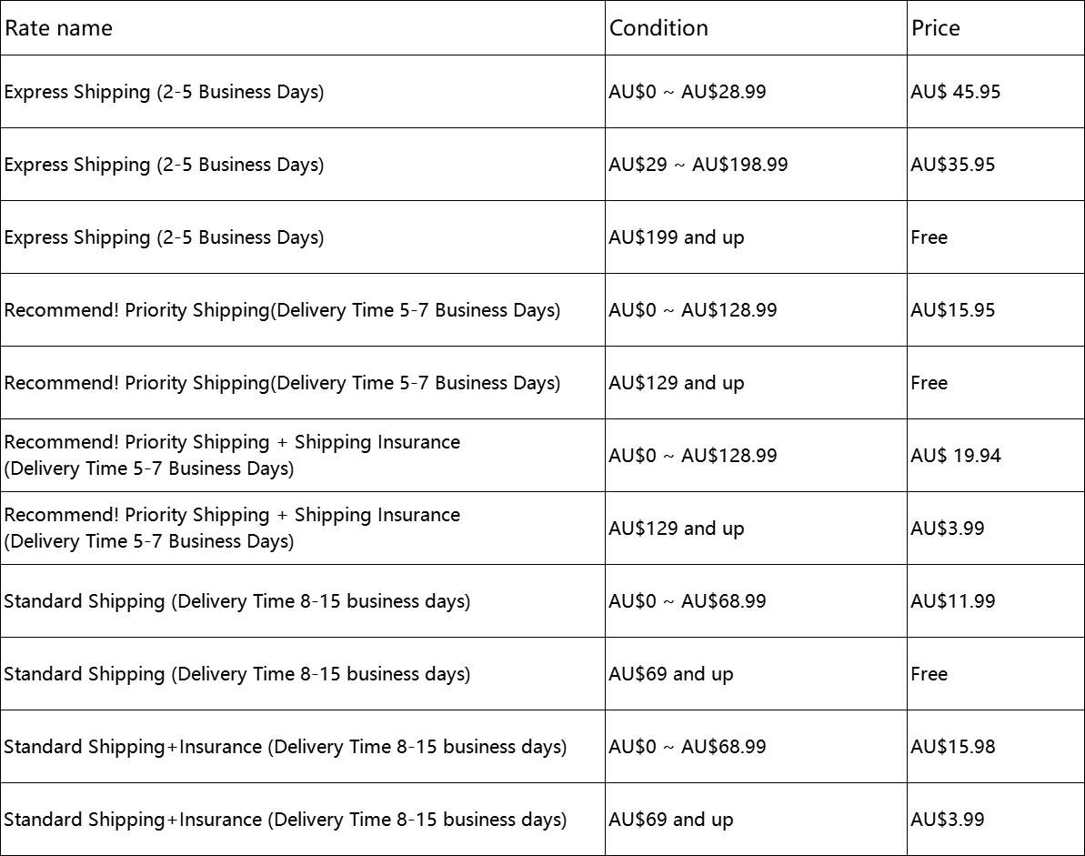 We are pleased to offer FREE Standard Shipping on all orders over A$69 to the entire AU For faster shipping service, you can select from our Standard Shipping or Expedited.