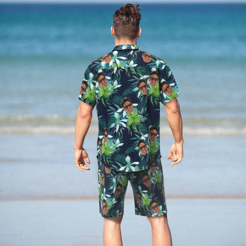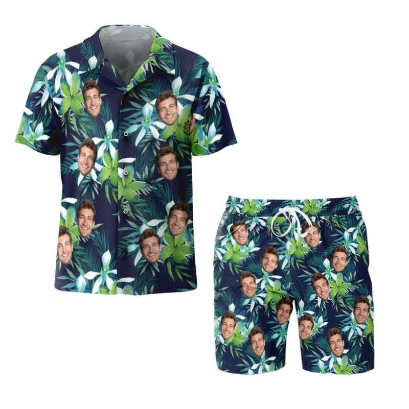 Custom Face Hawaiian Shirt And Beach Shorts Set Personalized Men's Photo Tropical Leaves Set Vacation Party Gift
