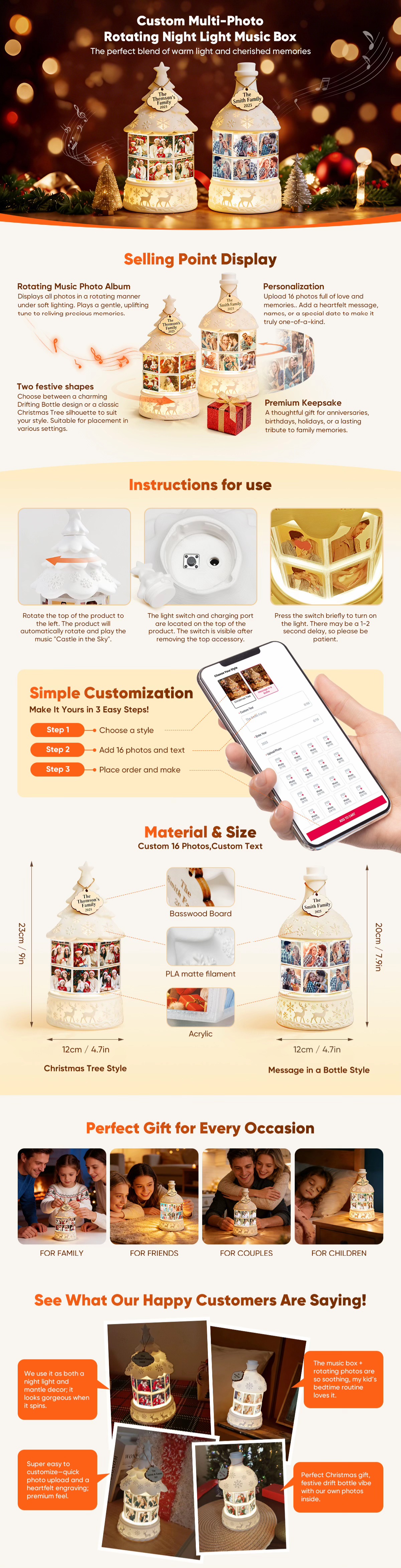 Custom Multi-Photo Rotating Night Light Music Box Engraved Family Keepsake Lamp Christmas Drift Bottle Light Christmas Tree Light Christmas Gift